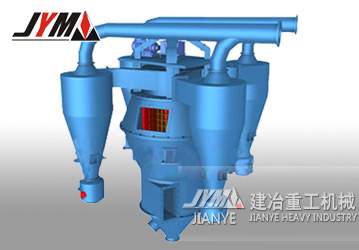 物料由进料管进入,经分散板撒到上升的气流中,物料中的粉磨介质碎片在重力作用下,克服上升气流的阻力下落,由排渣口排出.挟带着粉体的气流上升至分级部分,通过导流叶片进入转子进行分级.导流叶片可使气流和粉体颗粒产生回转运动,进行预分级,并捕集由转子甩出来的粗颗粒,还可使气流的速度在整个转子的高度上均匀分布.被导流叶片捕集的粗颗粒落到粗粉锥体上,由粗粉出口排出,而细颗粒与气流经过转子叶片进入转子中部,由细粉出口送往收集装置.