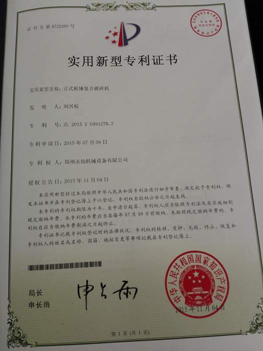立式板锤制砂机(立式板锤复合破碎机)是国家专利产品获得中华人民共和国国家知识产权局实用新型专利证书