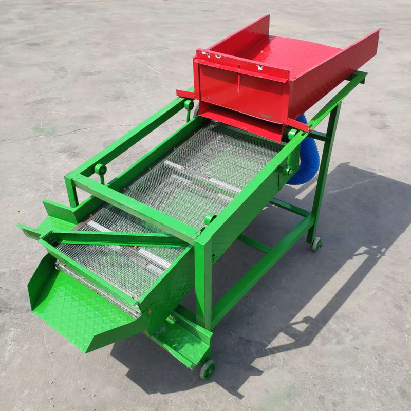 该精选筛为二层筛网,先经过进料口处风机抽风,直接抽走重量轻的杂叶或麦秸秆,上层筛的初次筛分再把大杂清理过,好的粮食(种子)直接落到下层筛网上,下层筛网会把粮食(种子)中的小杂质、小石子、有缺陷的粮食(种子)直接漏掉,完好的粮食(种子)会从出料口筛分出来。该小型清粮机解决了扬场机的功能单一,不能有效去除石子、土块的缺陷,更能为清理净选粮食(种子)带来满意的效果。该机有占地小,移动方便,便以维修,除尘除杂效率明显,能耗低,使用简便等优点。