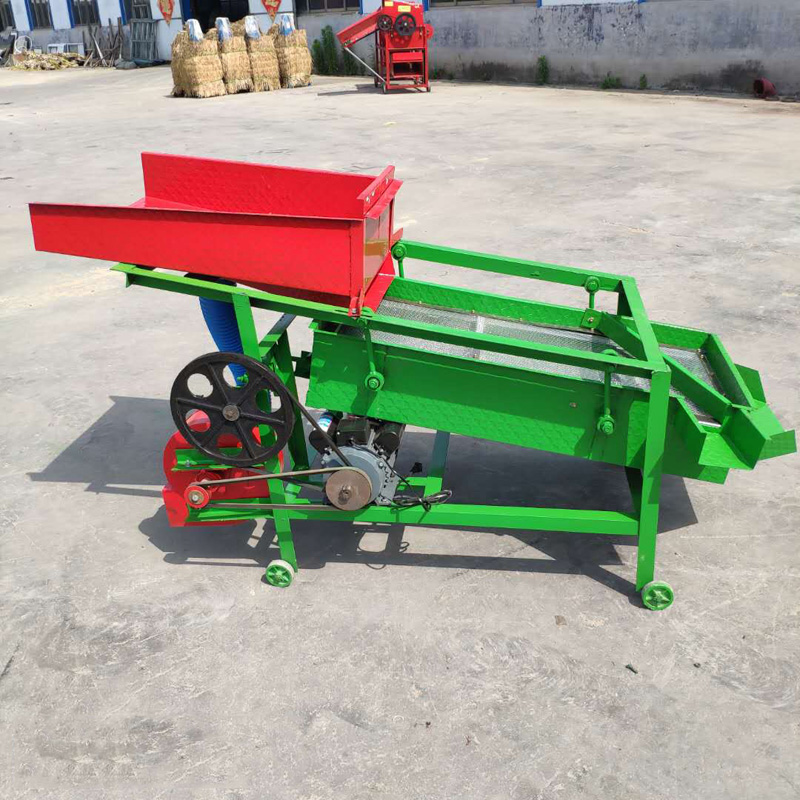该精选筛为二层筛网,先经过进料口处风机抽风,直接抽走重量轻的杂叶或麦秸秆,上层筛的初次筛分再把大杂清理过,好的粮食(种子)直接落到下层筛网上,下层筛网会把粮食(种子)中的小杂质、小石子、有缺陷的粮食(种子)直接漏掉,完好的粮食(种子)会从出料口筛分出来。该小型清粮机解决了扬场机的功能单一,不能有效去除石子、土块的缺陷,更能为清理净选粮食(种子)带来满意的效果。该机有占地小,移动方便,便以维修,除尘除杂效率明显,能耗低,使用简便等优点。